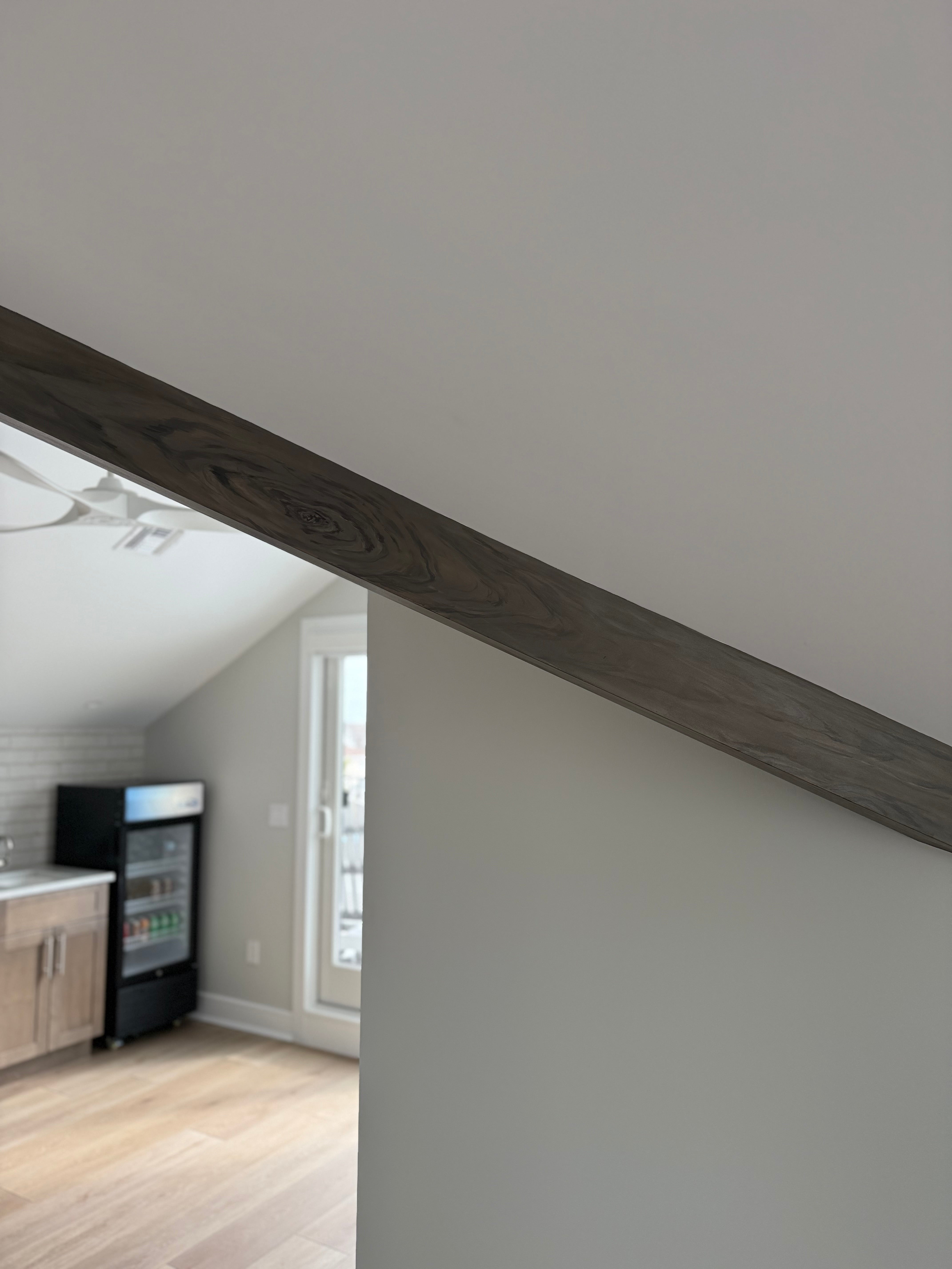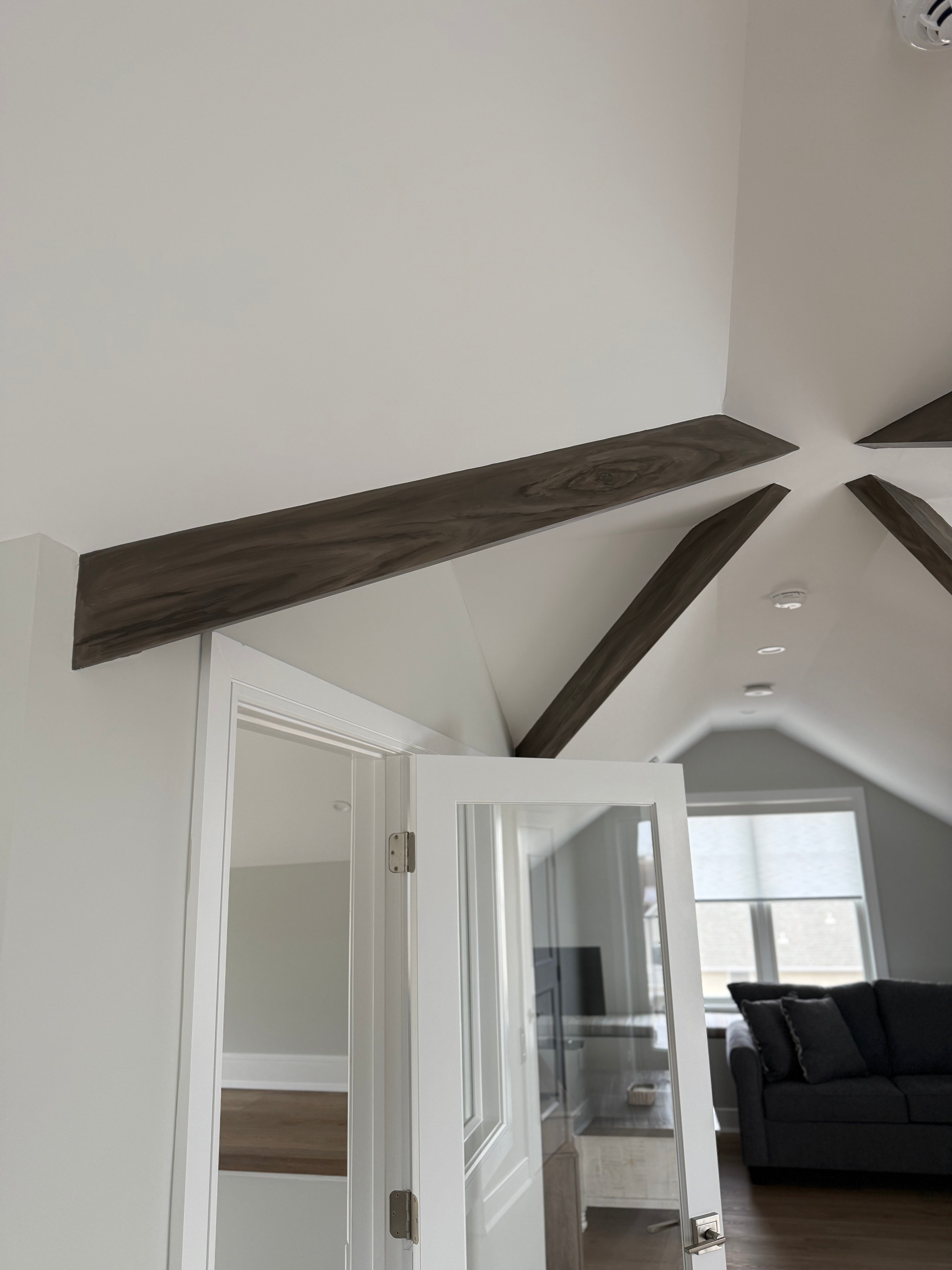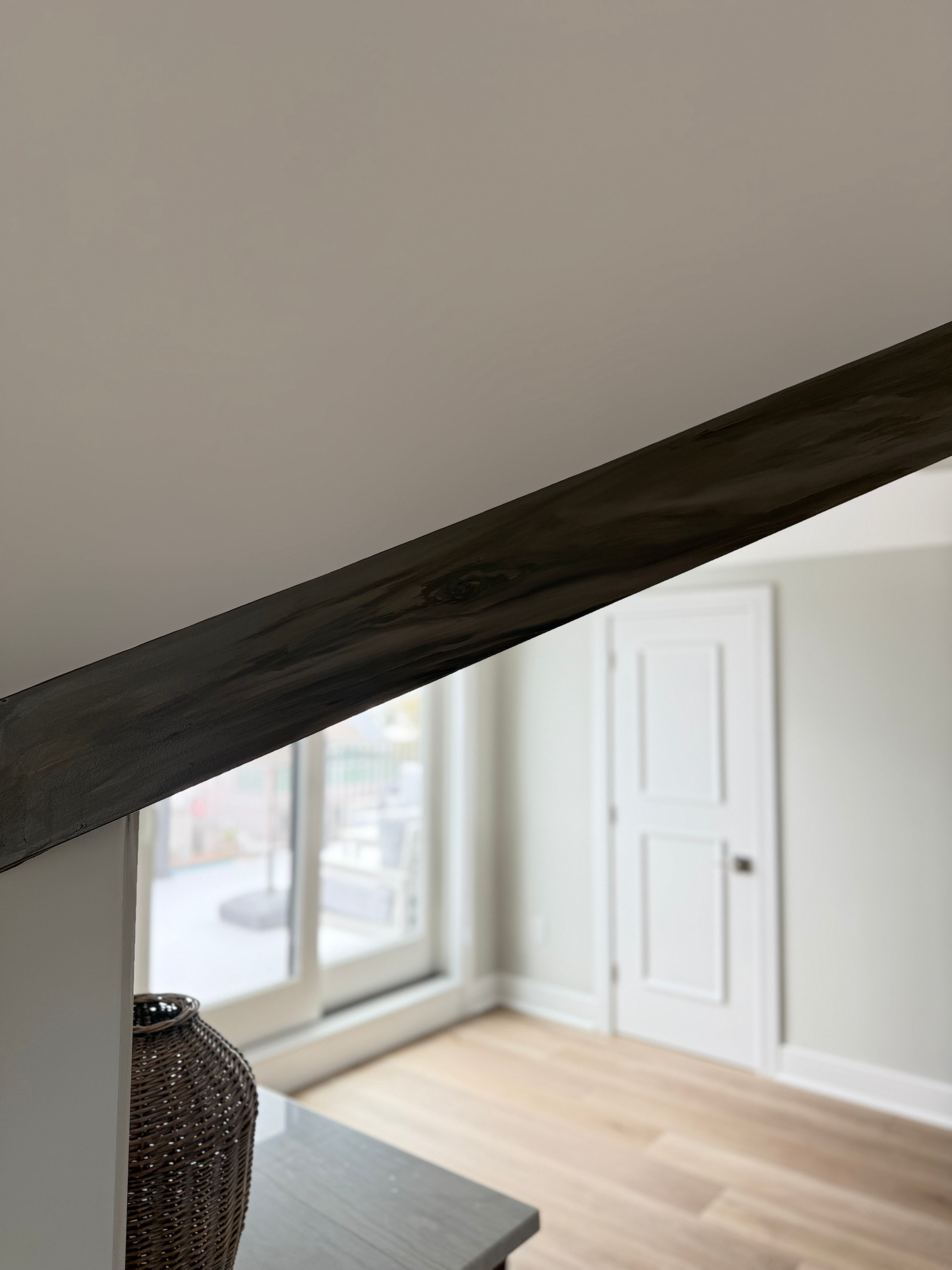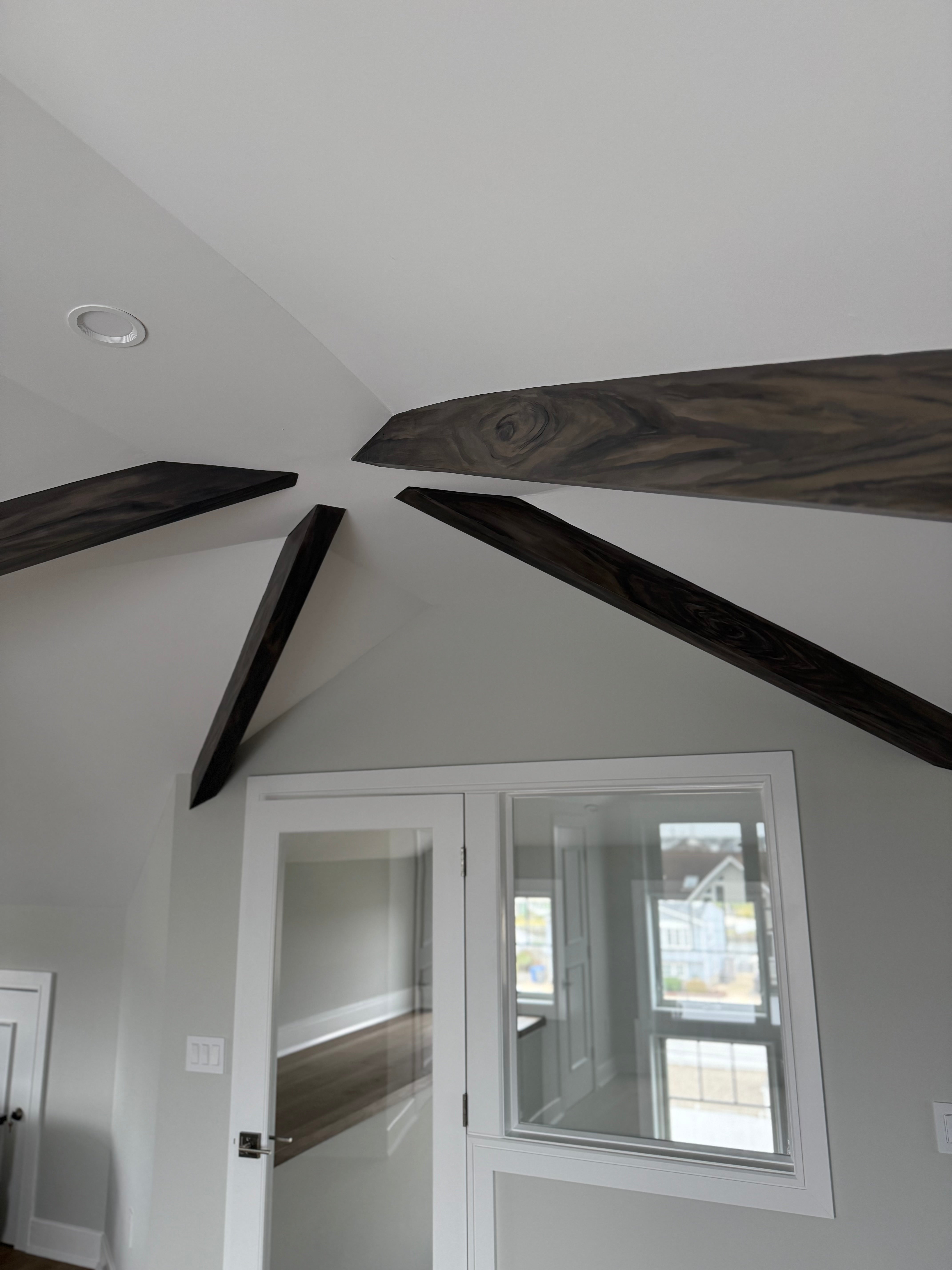 Hand-painted faux bois finish transforming smooth ceiling beams into realistic wood. The custom grain direction radiates from the ridge to accent the vaulted ceiling and frame the glass door below, adding warmth without the weight or cost of solid timber.
