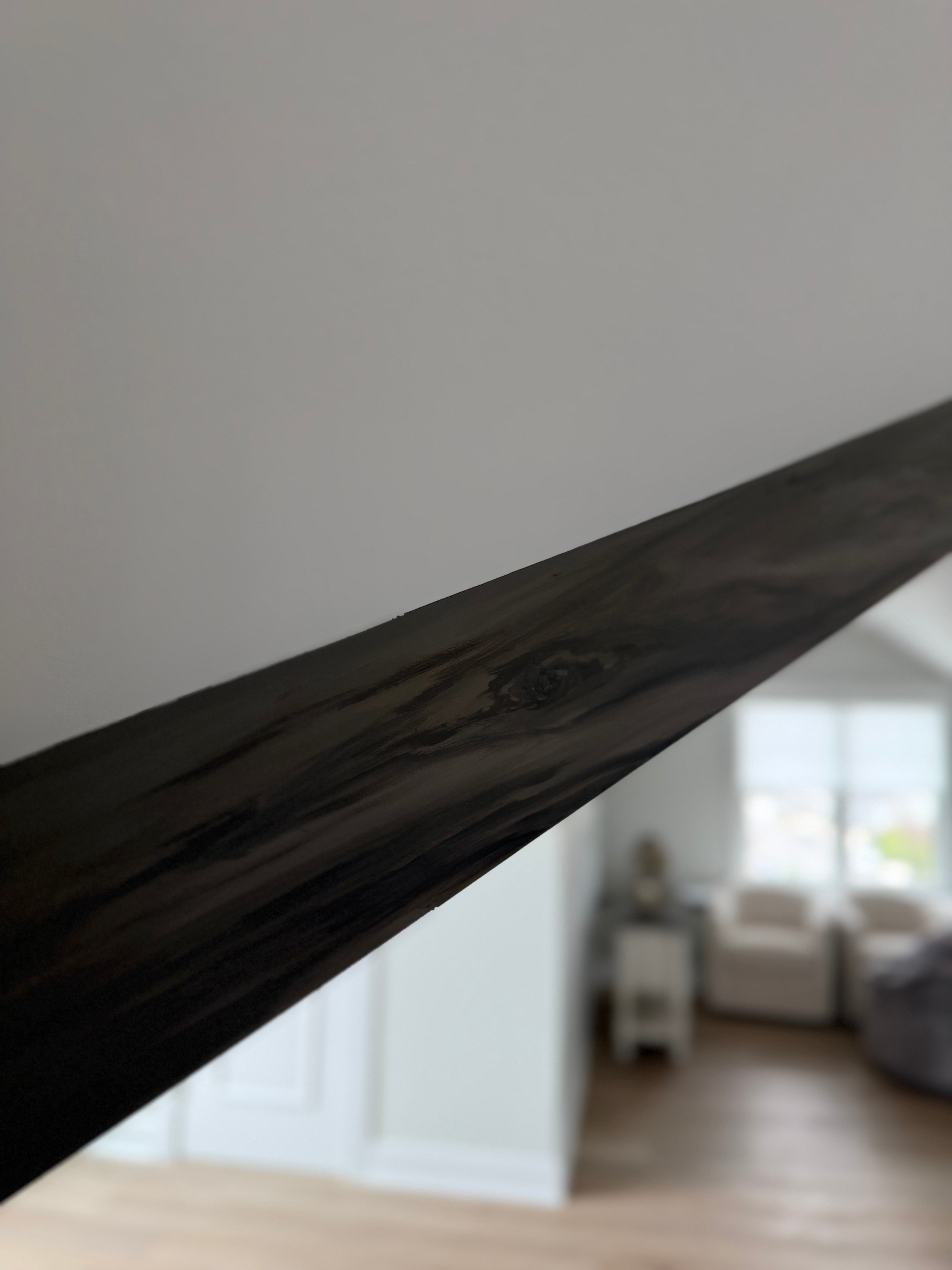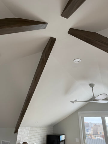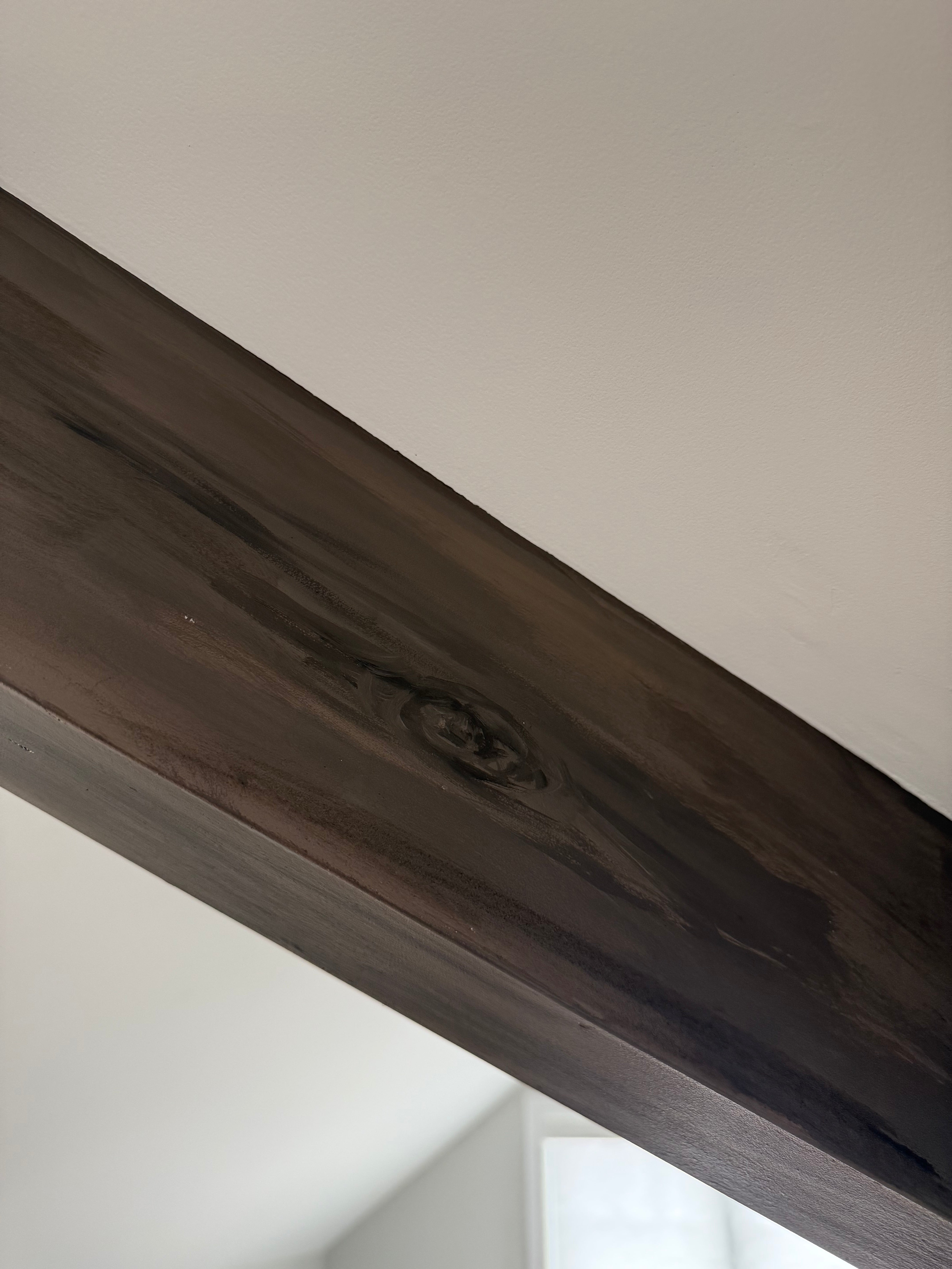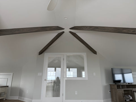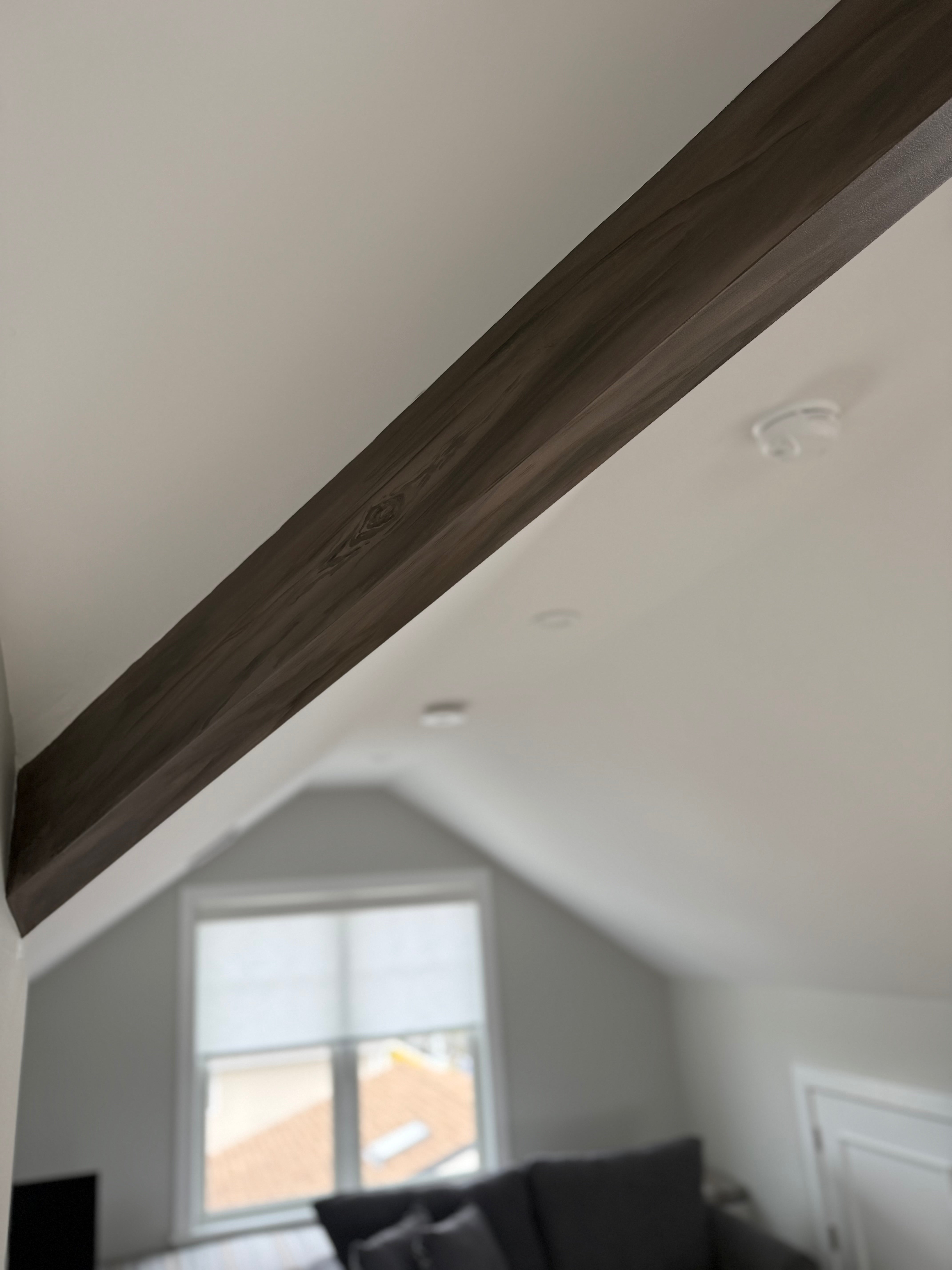 Hand-painted faux bois finish transforming smooth ceiling beams into realistic wood. The custom grain direction radiates from the ridge to accent the vaulted ceiling and frame the glass door below, adding warmth without the weight or cost of solid timber.