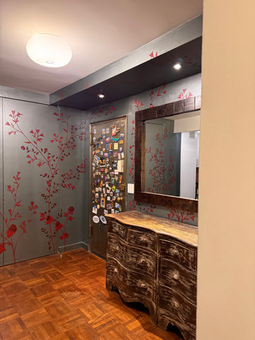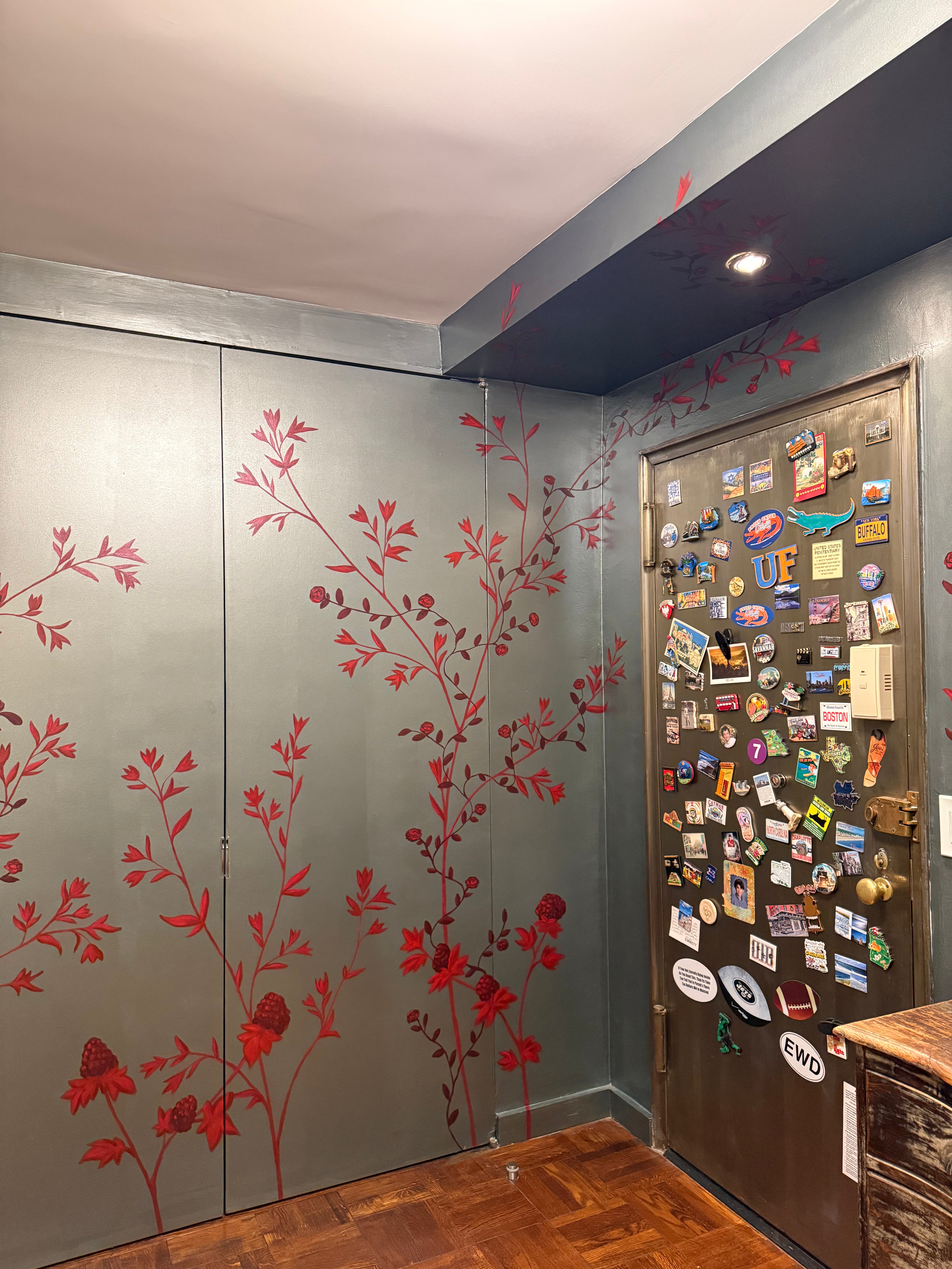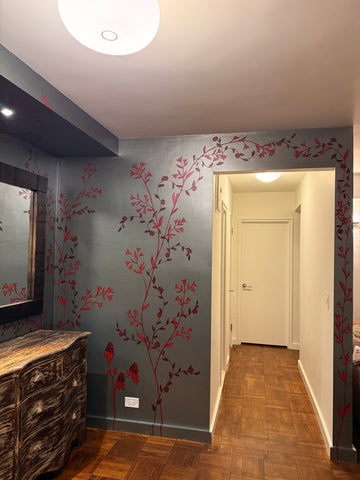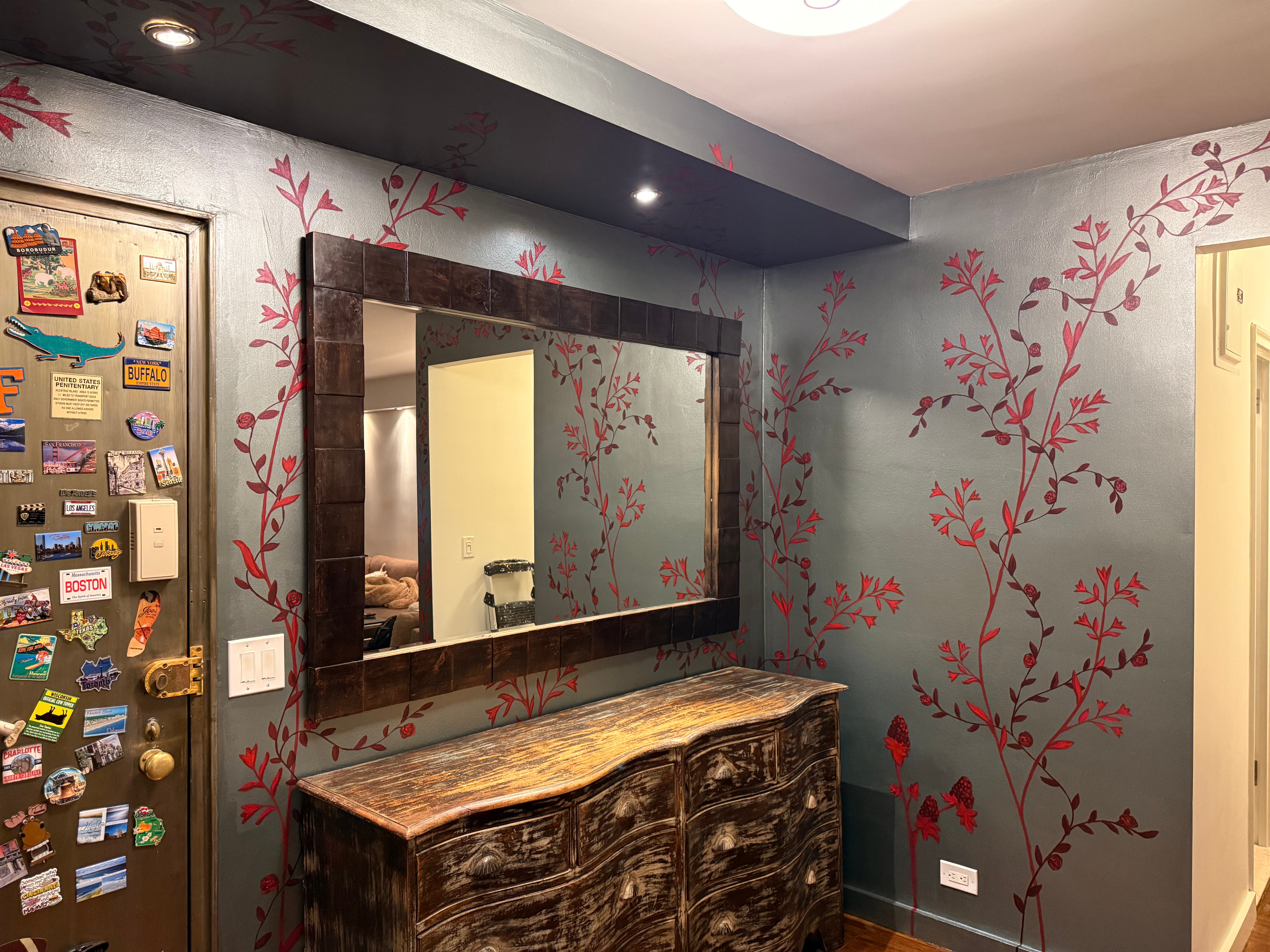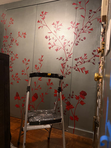 A custom floral mural for a private Upper East Side apartment, designed to sit beautifully match the future sofa. We built the palette on site—testing swatches on the wall and matching to the client’s fabric sample—so the colors and linework feel effortless once the furniture arrives.