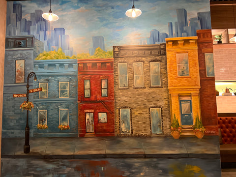 The Evolution by Chef Eric LeVine showcases two hand-painted murals by Karina Smyrnova that give artful nods to the neighborhood. One illustrates the evolution of the Brooklyn Bridge, and the other celebrates Brooklyn’s iconic brownstones.