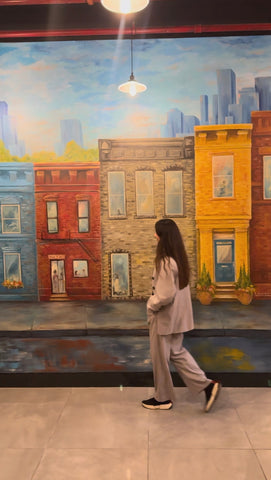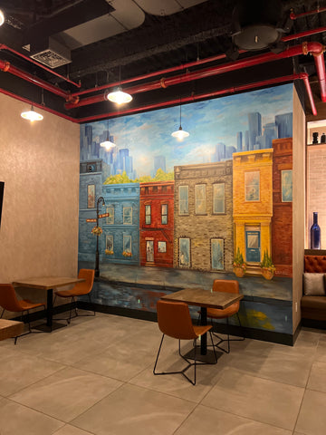 The design is cozy and rustic, enhanced by candles, mirrors, and two murals by Karina Smyrnova—one depicting the evolution of the Brooklyn Bridge and the other highlighting iconic Brooklyn brownstone buildings.