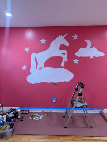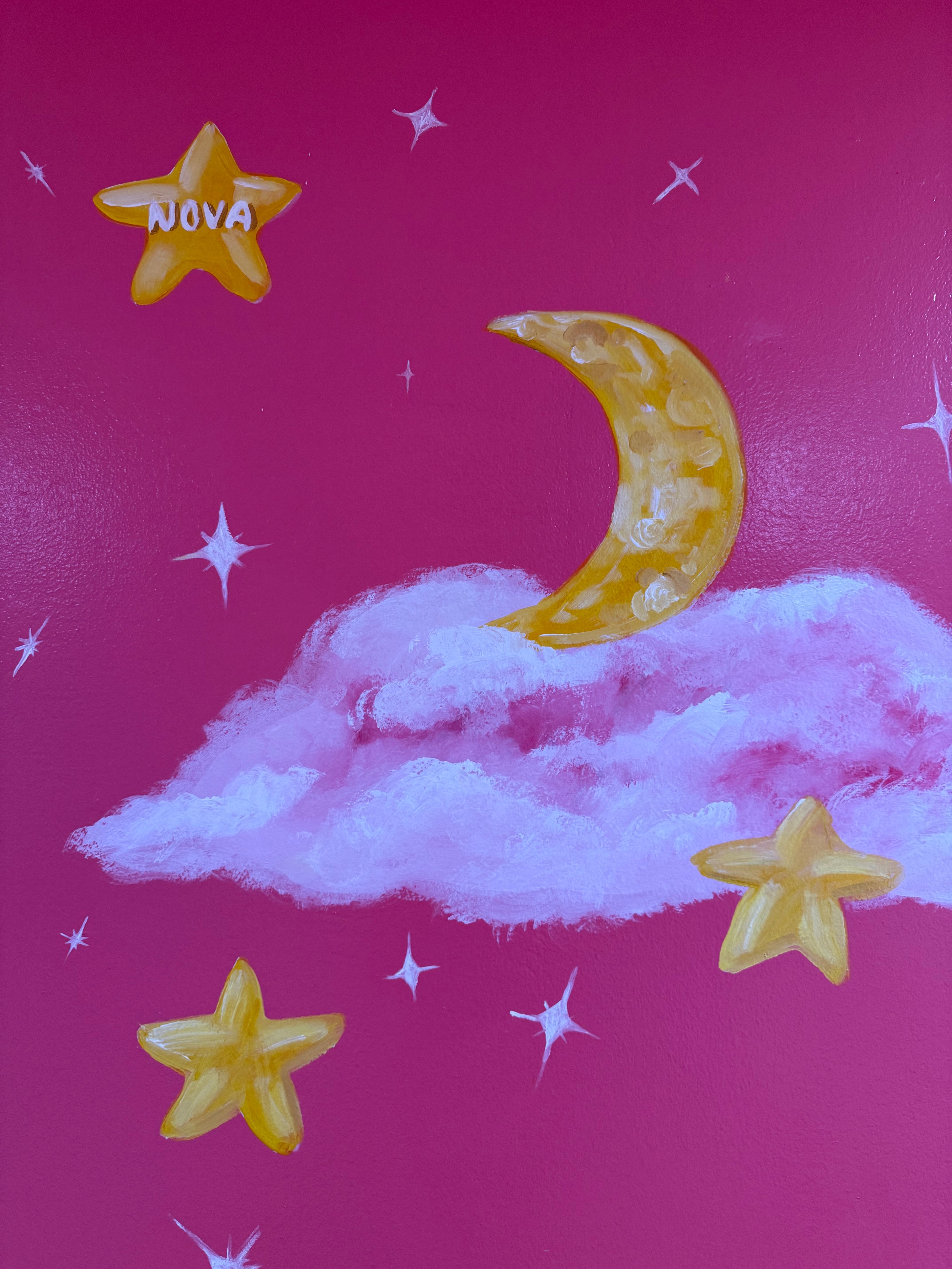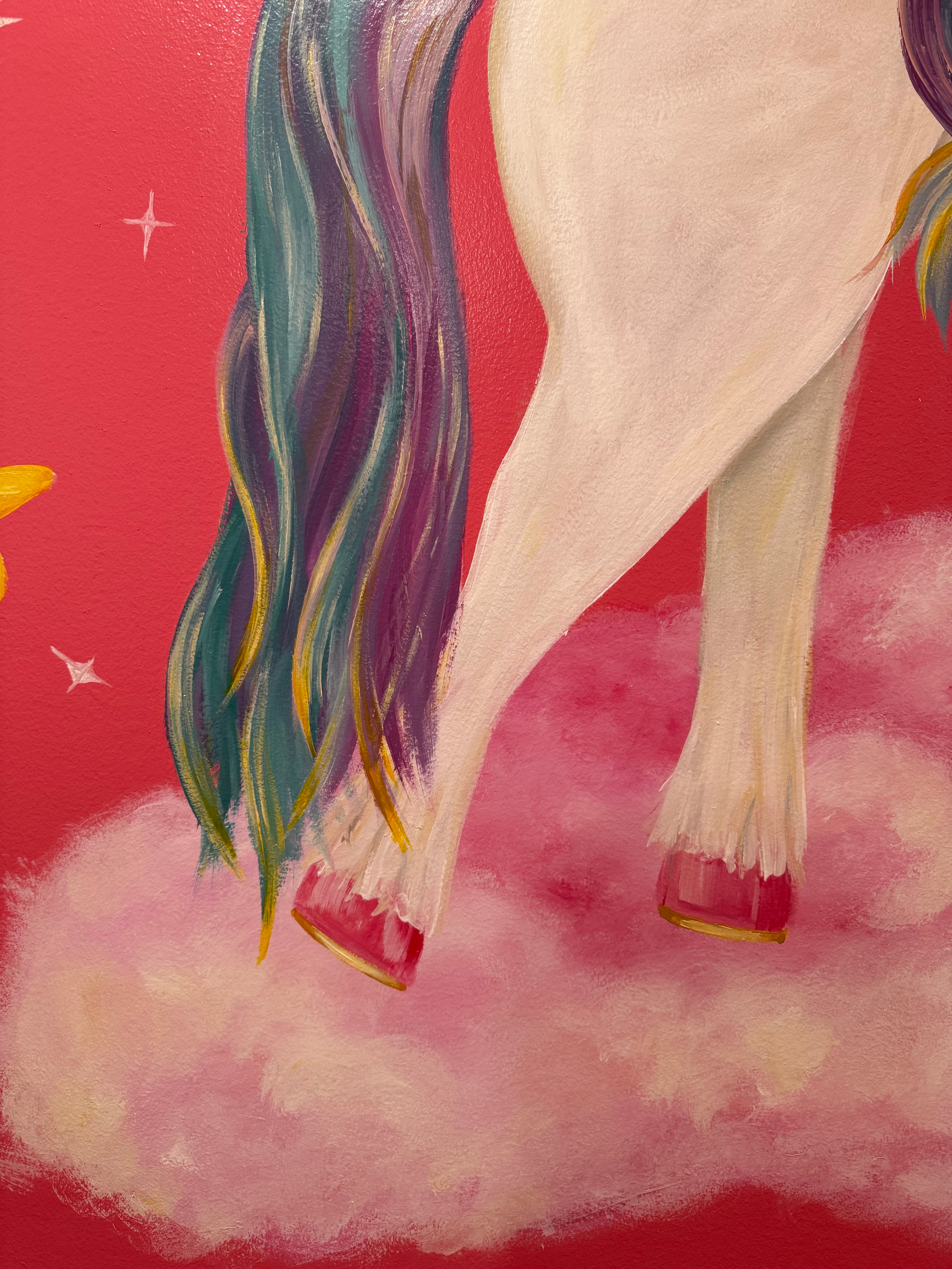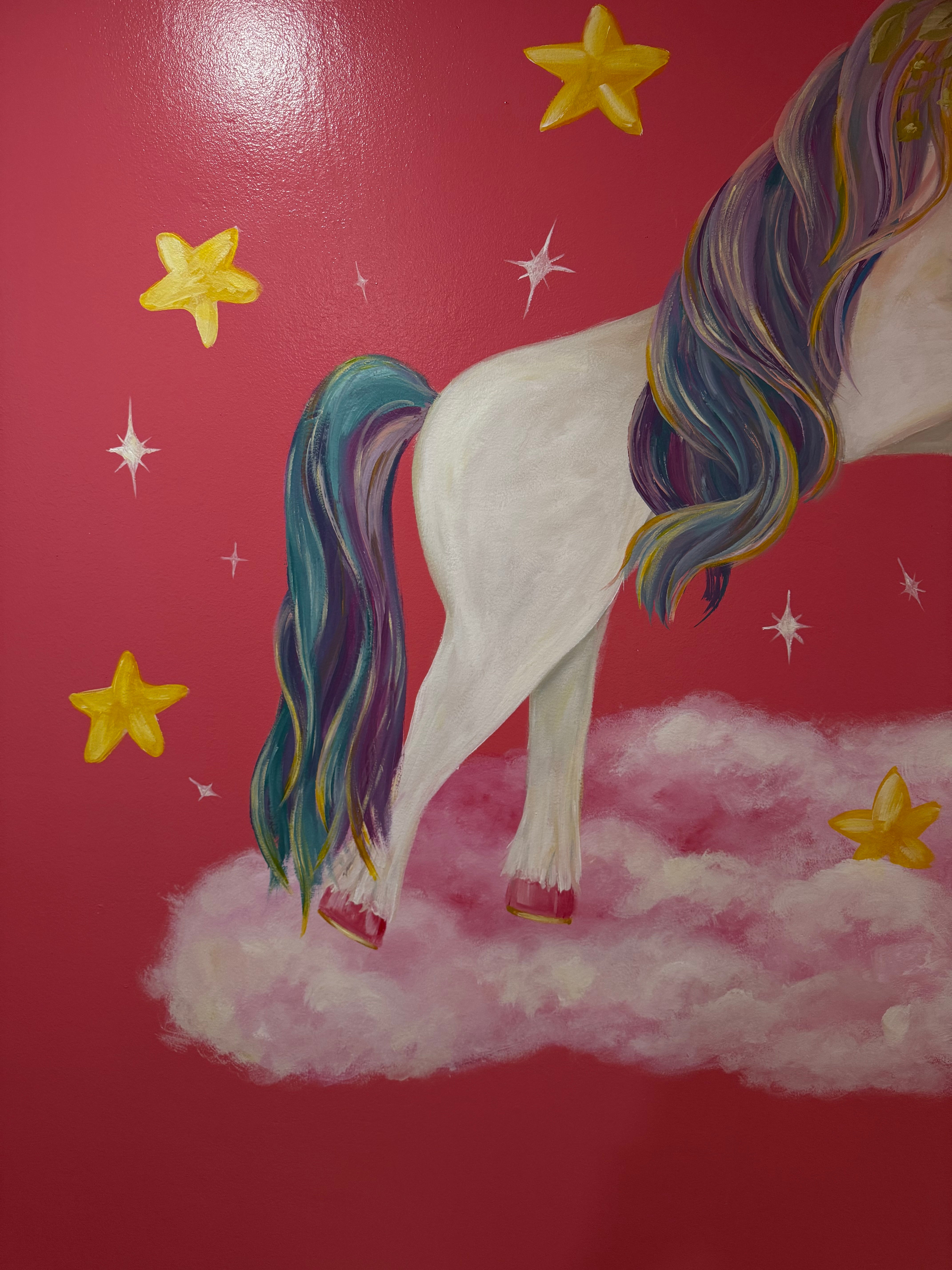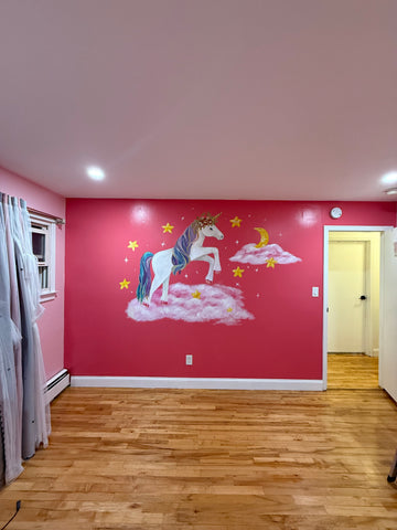 A dreamy, custom mural created for Nova—a bright, storybook scene with a white unicorn leaping across cotton-candy clouds, surrounded by gold stars and a crescent moon. Painted on a lively pink wall, the piece turns the room into a cozy night sky where make-believe lives all day.
