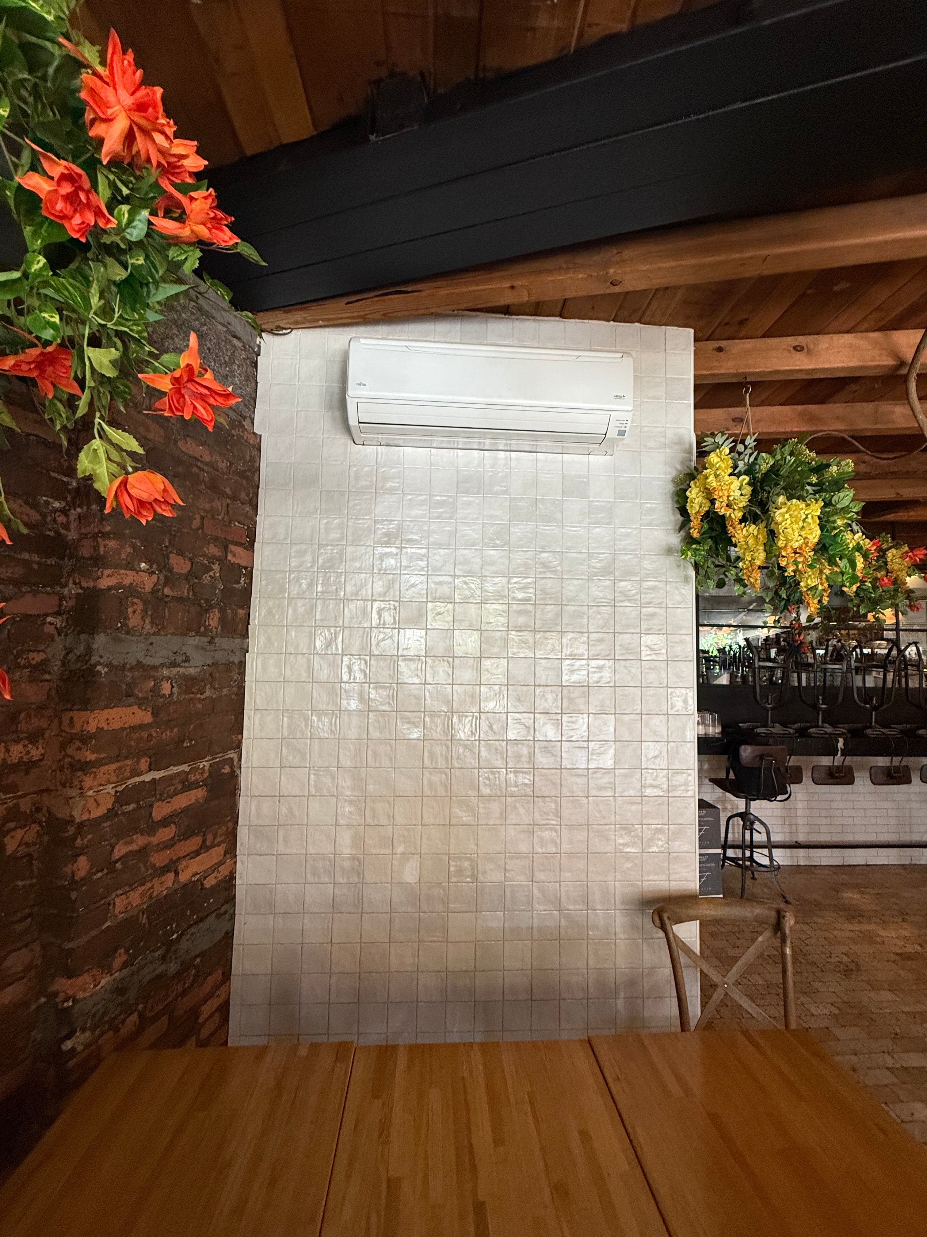 The artwork was painted off-site on polytab (non-woven mural cloth) to allow clean studio detailing and schedule flexibility. After sealing, the mural was adhered directly to the existing tile wall, producing a smooth, seamless surface while preserving the space. Warm perimeter lighting makes the colors glow during evening service.