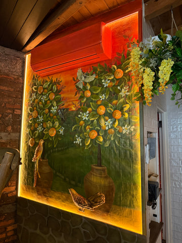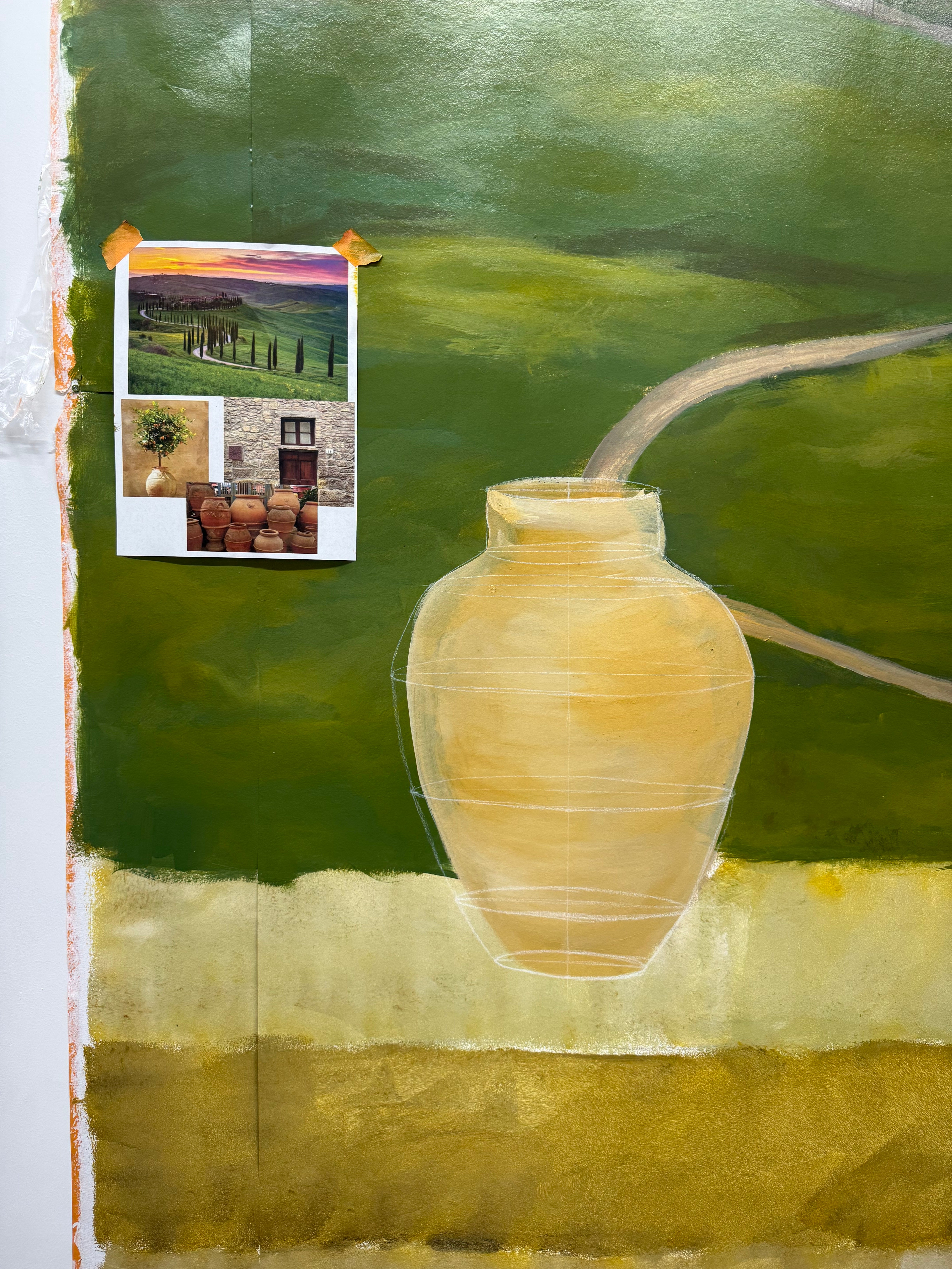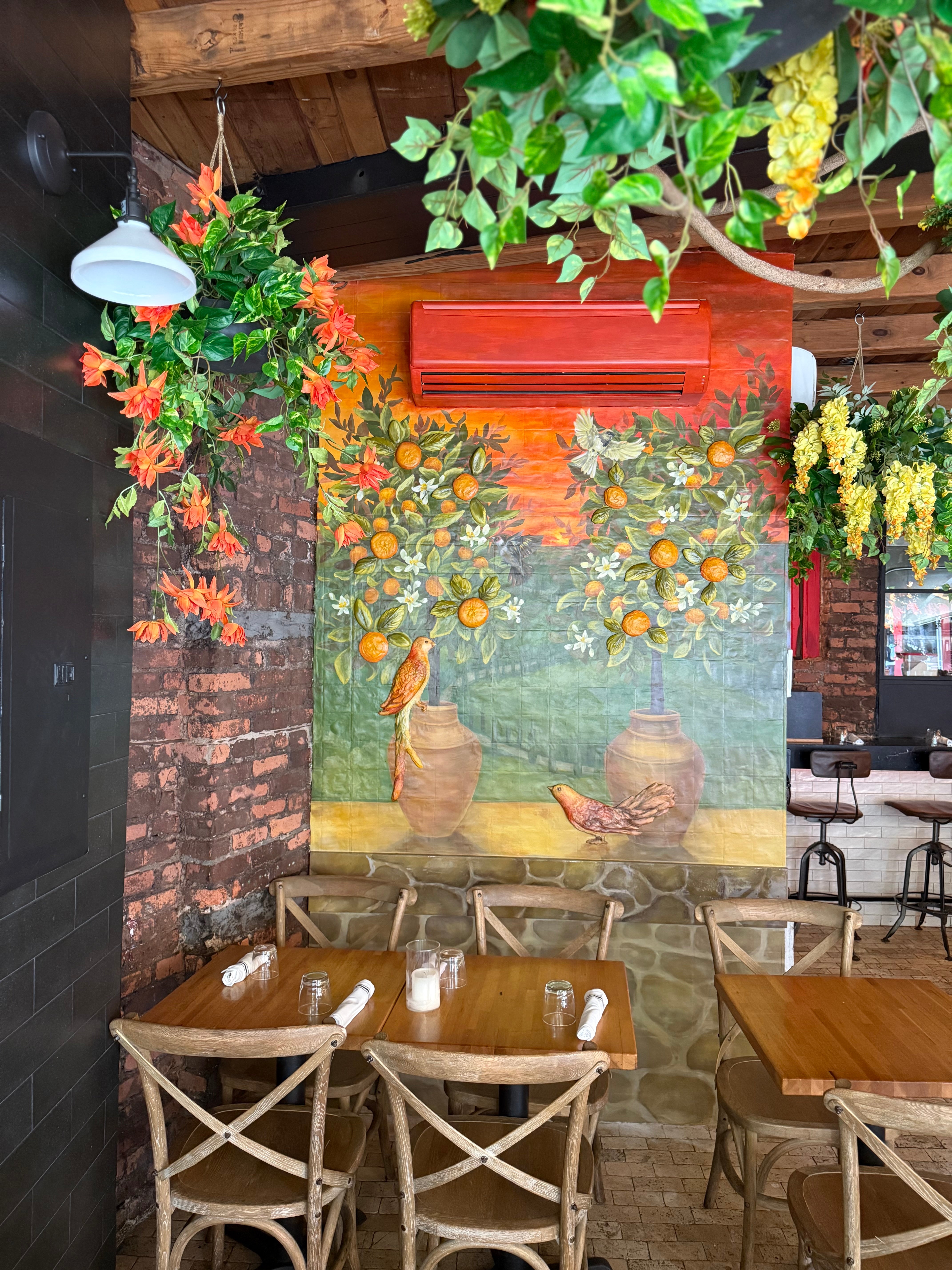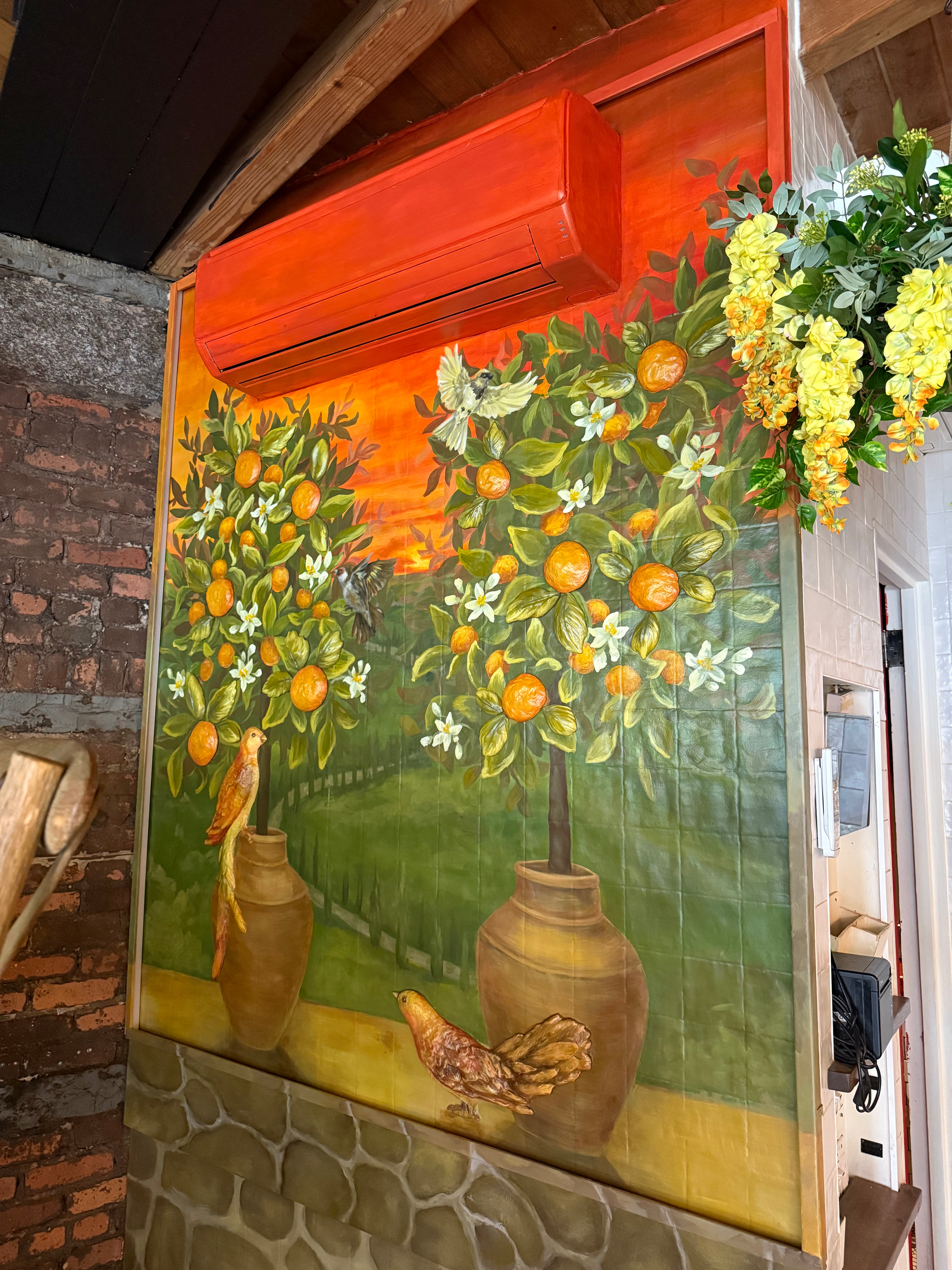 A custom mural for Canto West Village that matches the restaurant’s bright, joyful vibe. The scene captures a Tuscany farm at sunset—rows of greenery behind orange trees in bloom.