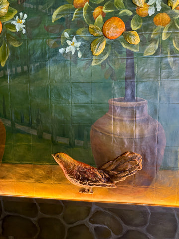 - Motifs: citrus trees, blossoms, terracotta jars, vineyard perspective, and four symbolic birds.