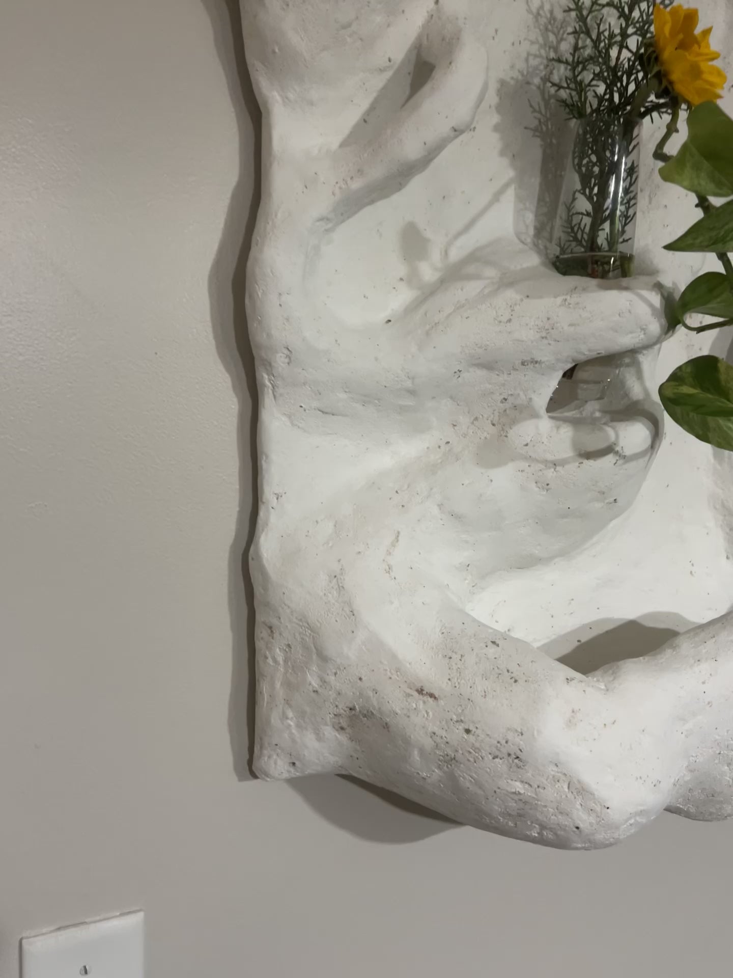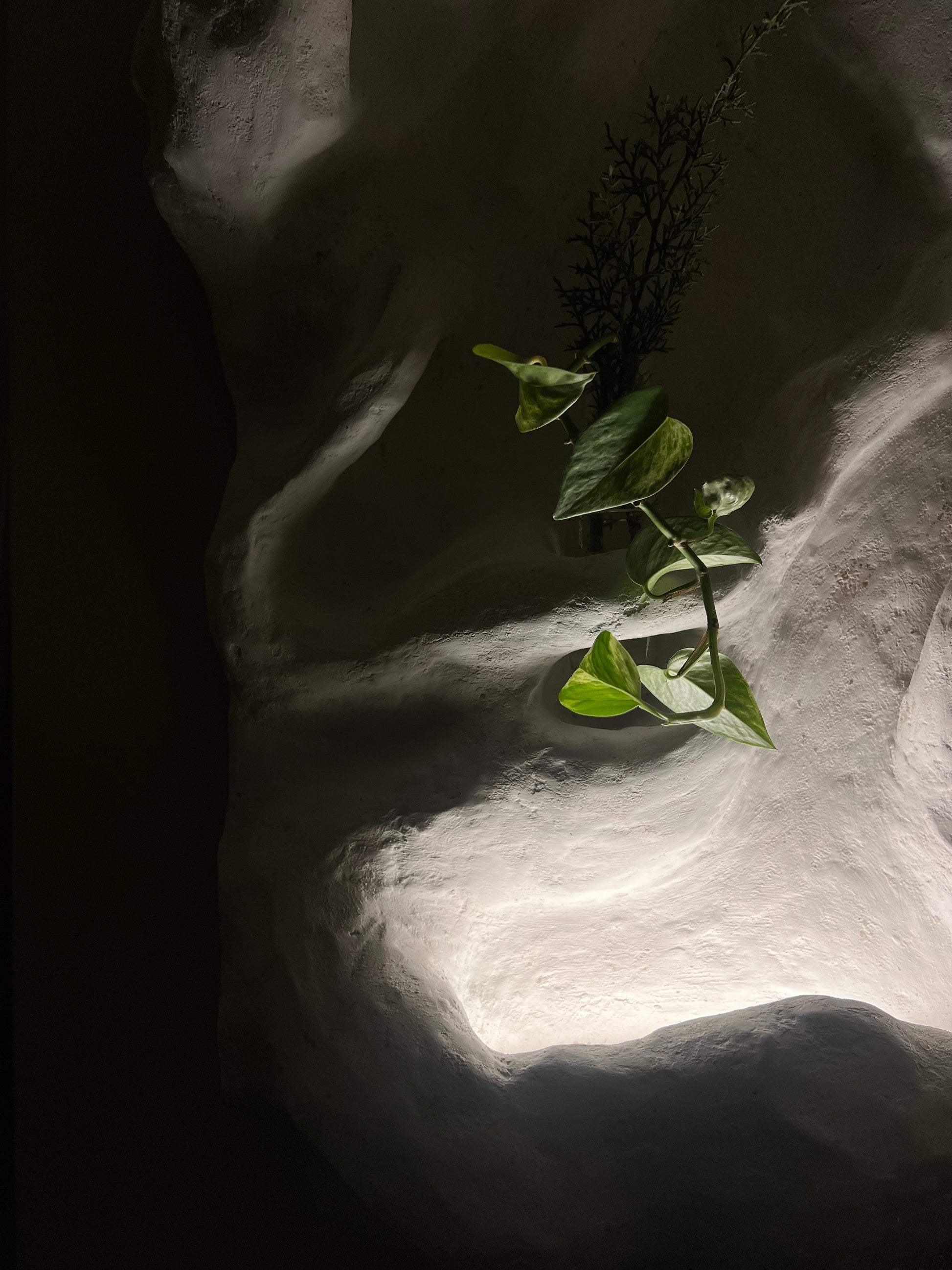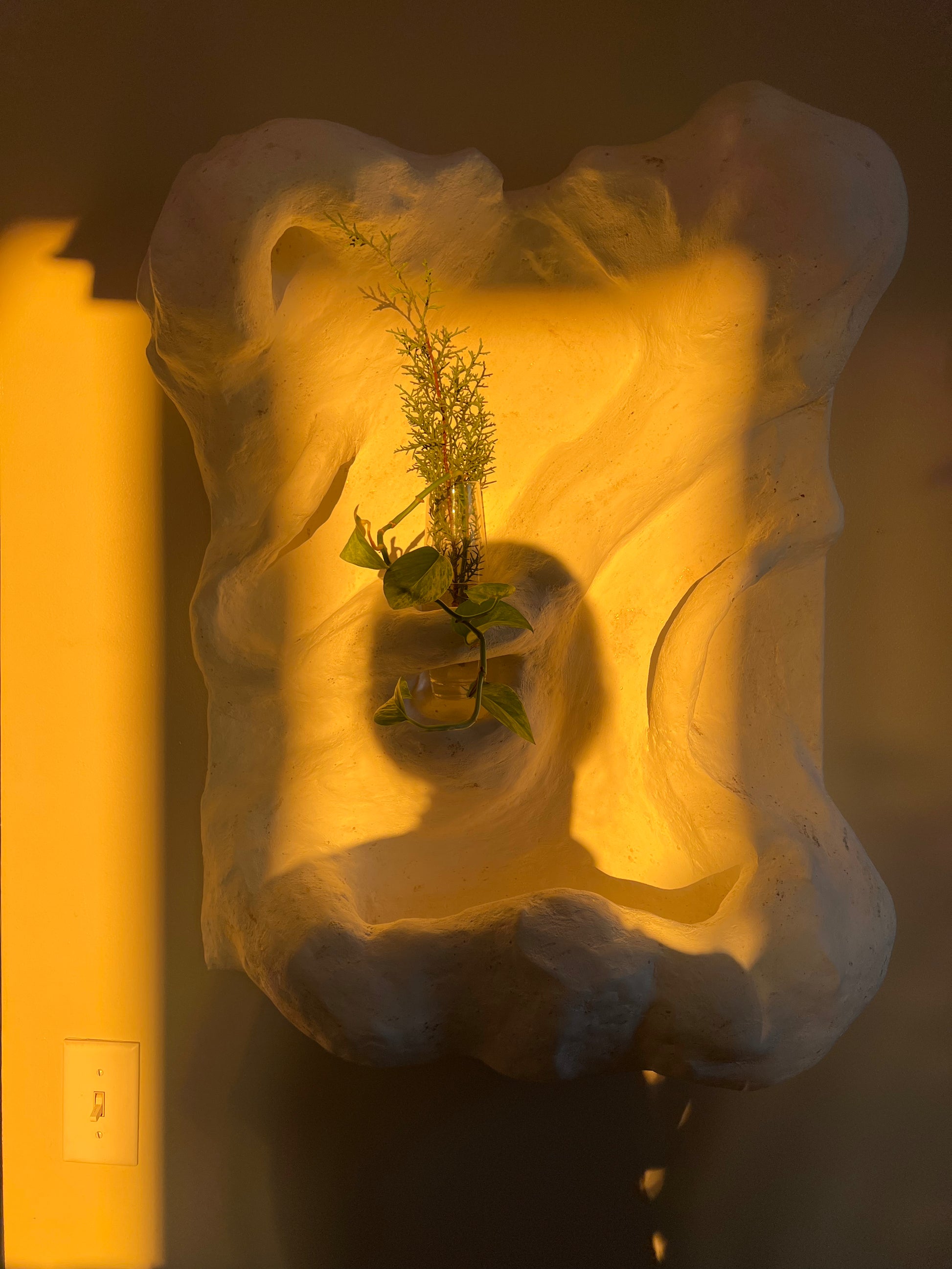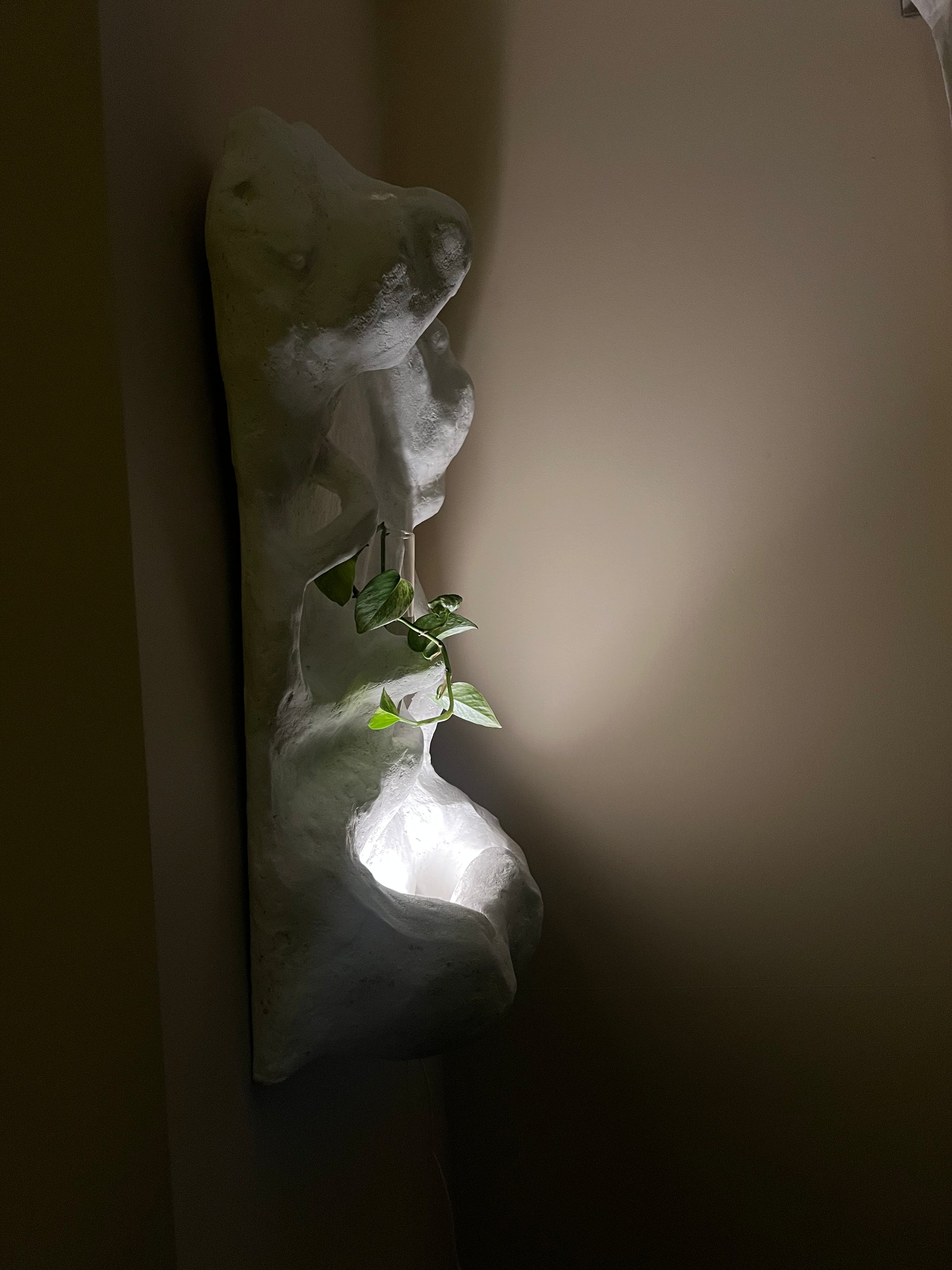 This art object for interior decor combines artistic elegance with functionality, featuring integrated lighting (with both remote rechargeable and plug-in options) and a small vase for flowers.