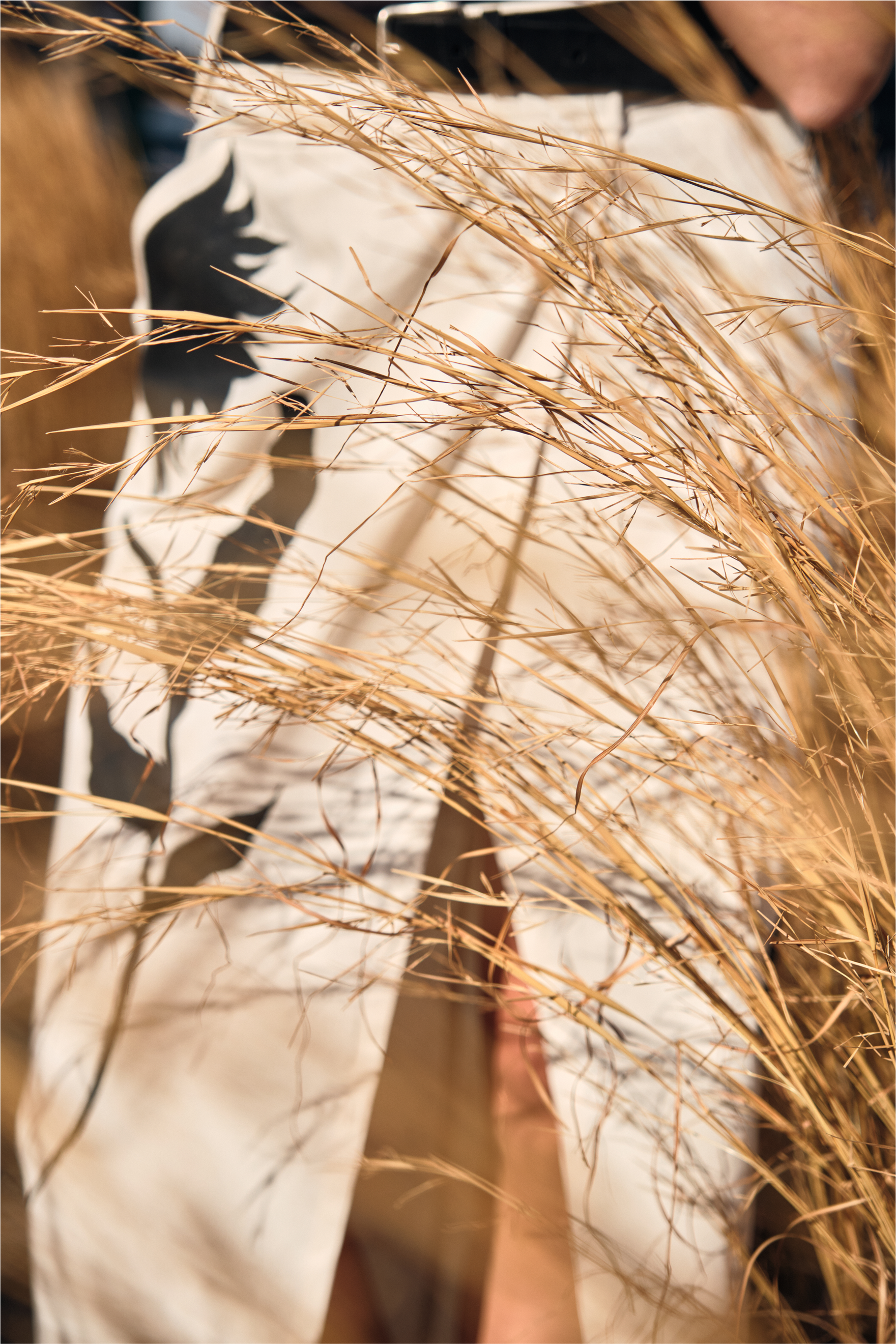 This one-of-a-kind skirt carries a story painted in simple, bold lines. The sunflower stands as a symbol of strength, loyalty, and light. It also carries a profound connection to Ukraine, Karina’s home country, where fields of sunflowers represent resilience, hope, and national identity.