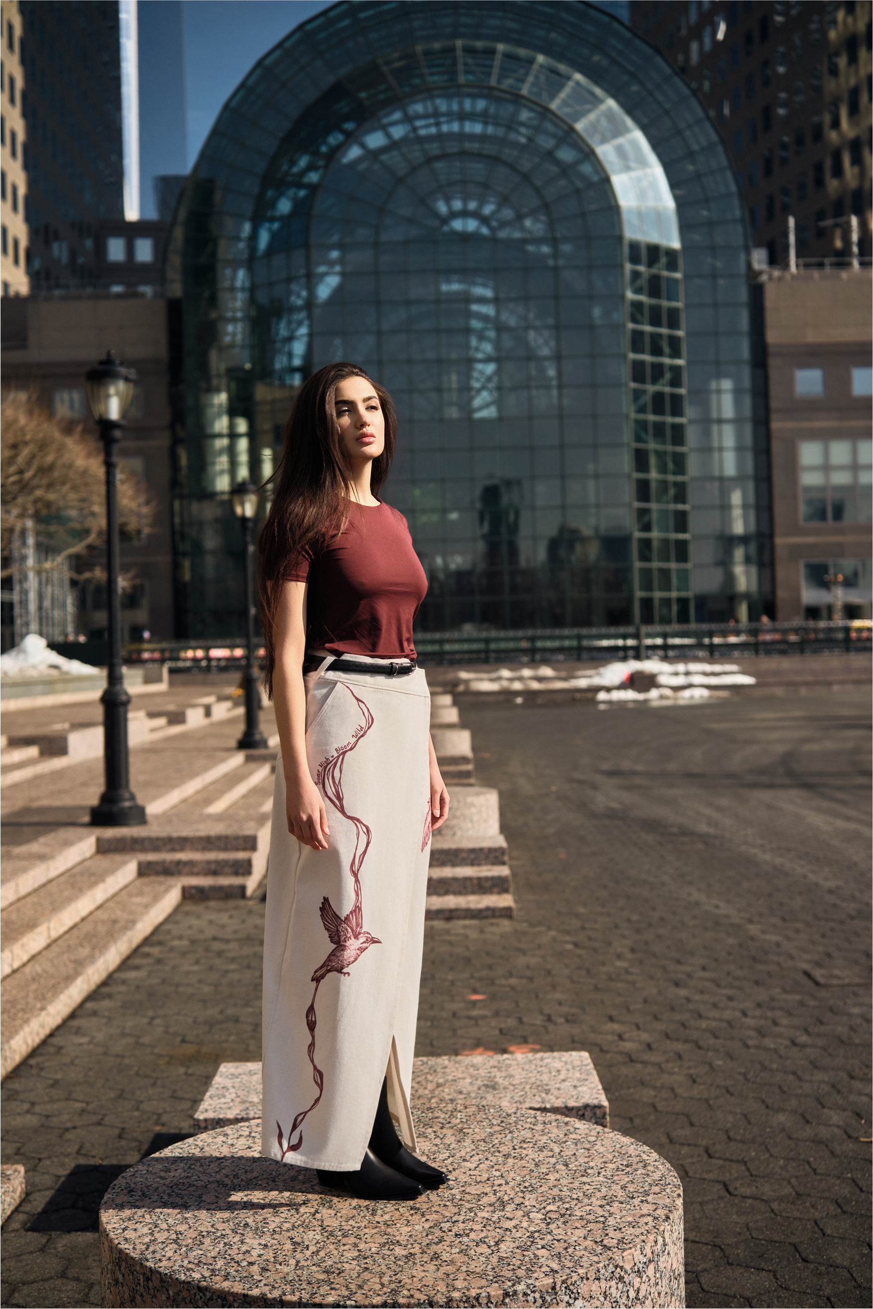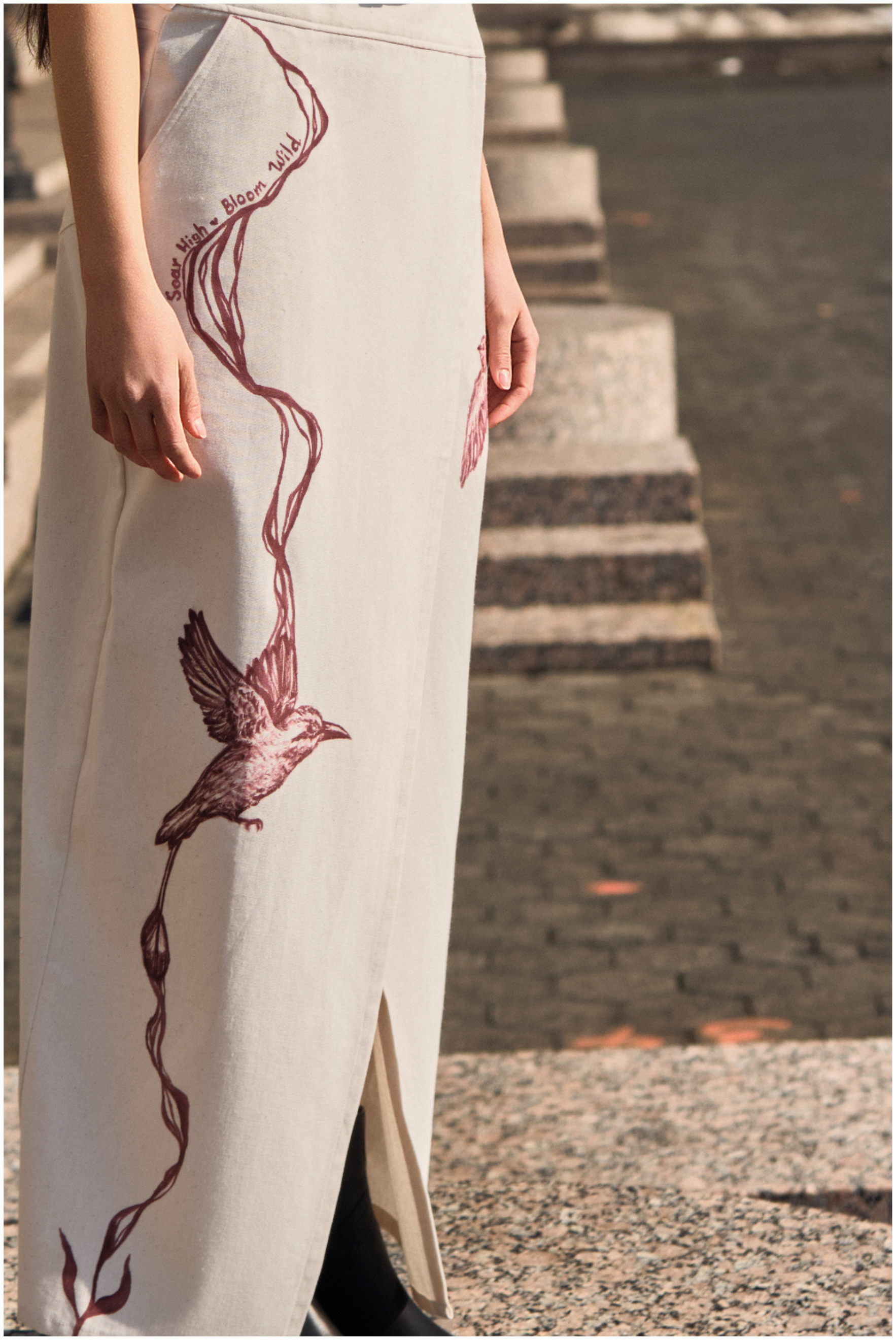 Each motif is painted by hand, making this skirt not just a garment but a piece of wearable storytelling, where nature, identity, and culture meet.