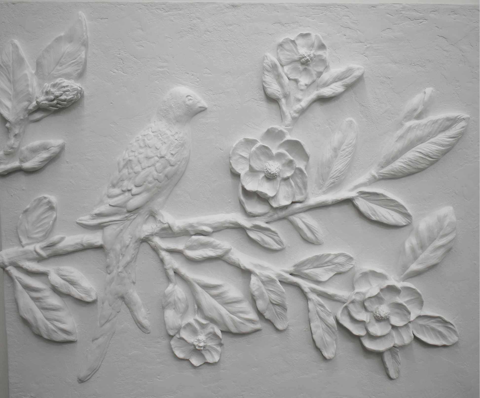 A hand-sculpted botanical scene—perched bird, flowering branches, and soft plaster texture—bringing quiet depth and light play to any room. Each petal and leaf is carved by hand and casted with plaster, then primed and painted for durability and easy care.
